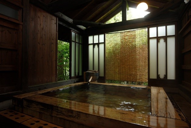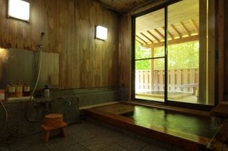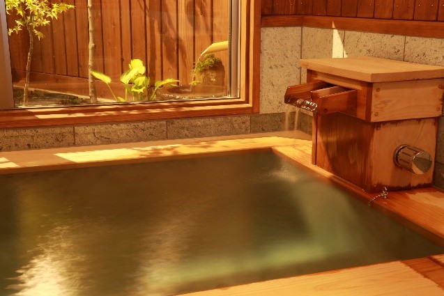 離れ専用の檜風呂は、源泉掛け流し。日中は檜風呂の窓から九重の四季を感じ、日が沈めば、木造りの浴室は木の重厚さが増し、古民家の趣をより感じられます。