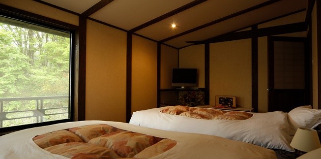 客室は広く、ベッドタイプなのも嬉しいポイント。大きく切り取った窓や露天風呂からは、4000坪の自然庭園を眺められます。