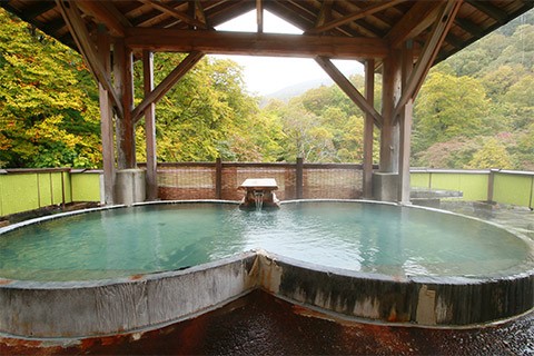 「白濁の湯」、「グリーンの褐色の湯」と、ふたつの源泉があり、開放感のある大パノラマ露天風呂で癒しのひと時をお過ごしいただけます。女将による山の幸たっぷりの田舎料理や、なんだかホッとする福島弁も大きな魅力です。また、1日3組限定でペット連れの方の宿泊受けております。